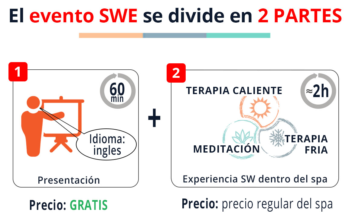 El evento SWE es una presentación sofisticada y única del poder de la sauna y la meditación para nuestra salud. Dividido en dos partes, comenzando con una presentación integral en forma fácil de entender y continúa con experiencia práctica dentro del Spa.